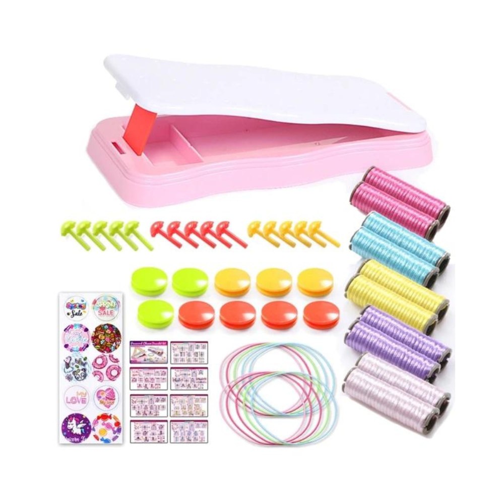 Med et udvalg af farverige reb og flettemaskiner giver dette sæt børn mulighed for at udfolde deres kreativitet og skabe unikke armbånd.